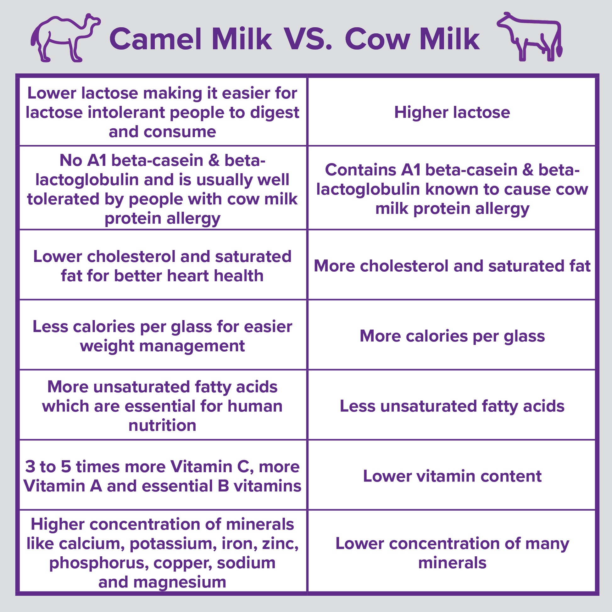 - Why camel milk? Camel milk is considered a superfood because it is packed with much needed nutrition - vitamins and minerals your body needs plus high proportions of natural anti-bacterial and anti-viral substances, antioxidants and immune system boosters to protect your health.